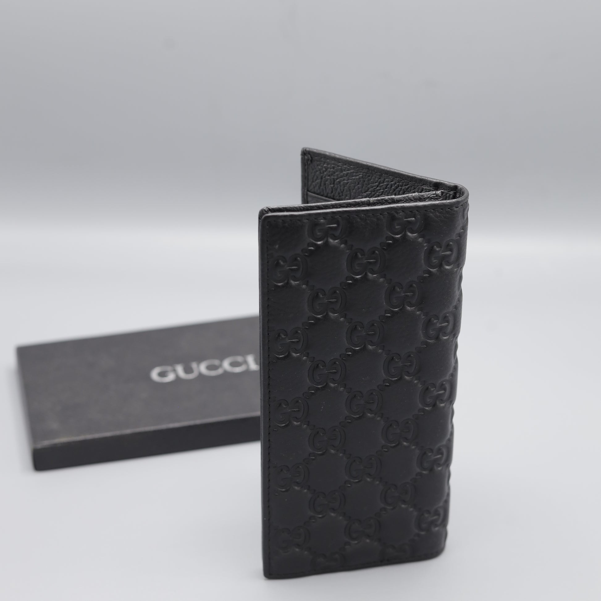 Elevate your everyday essentials with this sophisticated Gucci bi-fold wallet. Crafted from luxurious black leather, this wallet features the iconic GG monogram embossed pattern throughout, offering a subtle yet unmistakable touch of designer elegance. Designed for both style and functionality, it provides ample space for your cards and cash, keeping your valuables organized and secure. Perfect for the discerning individual who appreciates timeless luxury and impeccable craftsmanship.