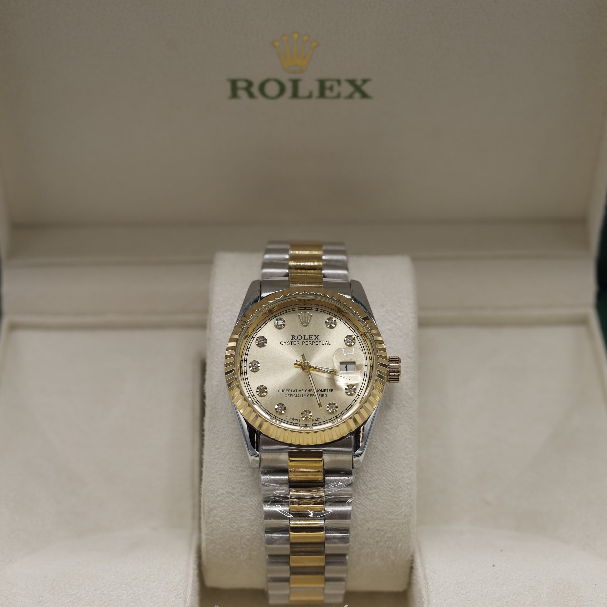 Elevate your style with this exquisite Rolex Oyster Perpetual timepiece, featuring a timeless two-tone design in gold and silver-tone stainless steel. This iconic watch boasts a stunning champagne-colored dial adorned with elegant diamond hour markers, exuding luxury and sophistication.