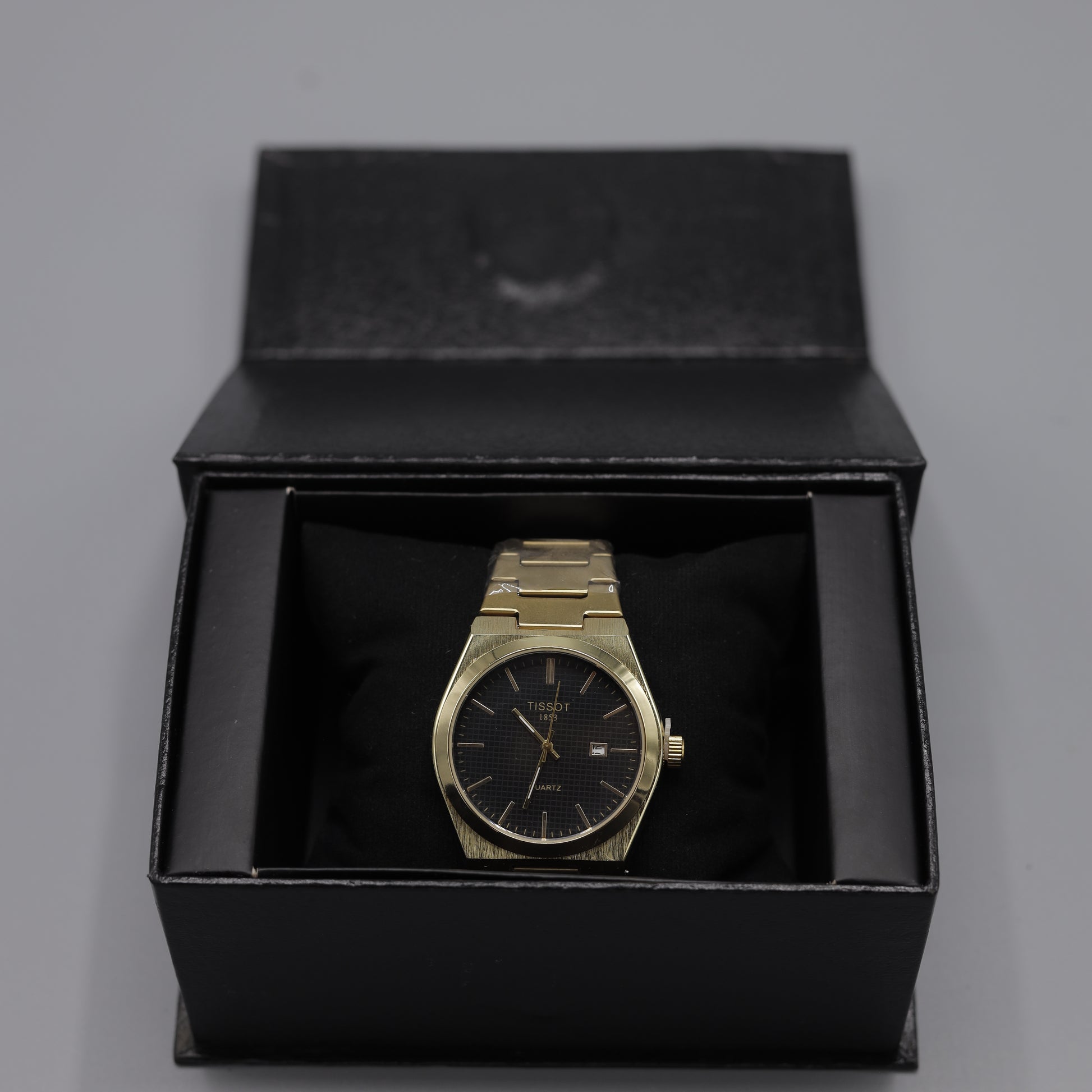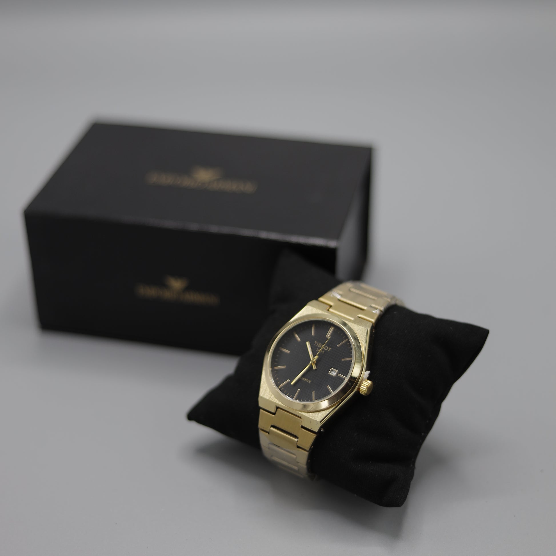 Elevate your style with the stunning Tissot PRX Quartz, a timepiece that effortlessly blends vintage charm with contemporary sophistication. Crafted with a luxurious gold-tone finish and a striking black dial, this watch is designed to make a statement, whether you're in the boardroom or at a social gathering